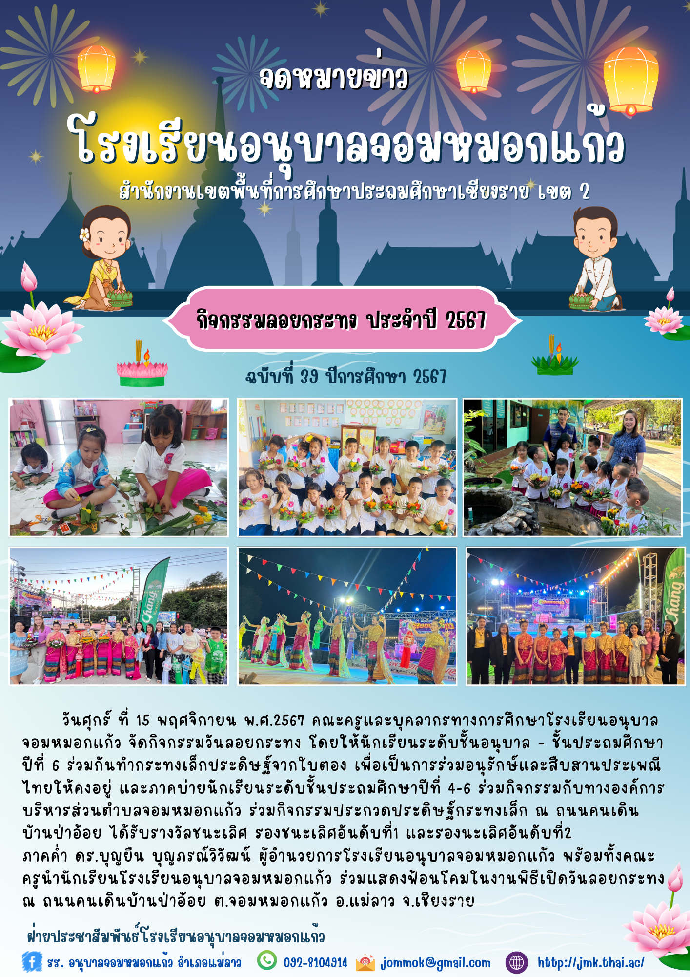 วันศุกร์ ที่ 15 พฤศจิกายน พ.ศ.2567 คณะครูและบุคลากรทางการศึกษาโรงเรียนอนุบาลจอมหมอกแก้ว จัดกิจกรรมวันลอยกระทง โดยให้นักเรียนระดับชั้นอนุบาล – ชั้นประถมศึกษาปีที่ 6 ร่วมกันทำกระทงเล็กประดิษฐ์จากใบตอง เพื่อเป็นการร่วมอนุรักษ์และสืบสานประเพณีไทยให้คงอยู่ และภาคบ่ายนักเรียนระดับชั้นประถมศึกษาปีที่ 4-6 ร่วมกิจกรรมกับทางองค์การบริหารส่วนตำบลจอมหมอกแก้ว ร่วมกิจกรรมประกวดประดิษฐ์กระทงเล็ก ณ ถนนคนเดินบ้านป่าอ้อย ได้รับรางวัลชนะเลิศ รองชนะเลิศอันดับที่1 และรองนะเลิศอันดับที่2