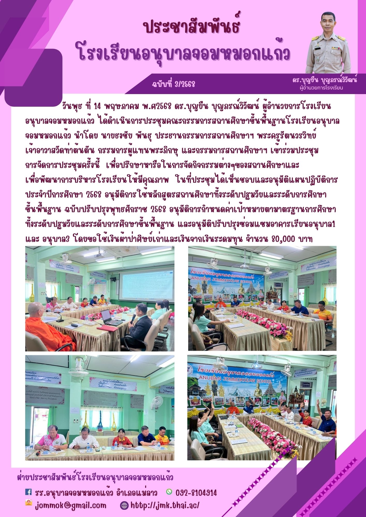 วันพุธ ที่ 14 พฤษภาคม พ.ศ2568 ดร.บุญยืน บุญภรณ์วิวัฒน์ ผู้อำนวยการโรงเรียนอนุบาลจอมหมอกแก้ว ได้ดำเนินการประชุมคณะกรรมการสถานศึกษาขั้นพื้นฐานโรงเรียนอนุบาลจอมหมอกแก้ว นำโดย นายธงชัย พันธุ ประธานกรรมการสถานศึกษาฯ พระครูรัตนวรวิทย์